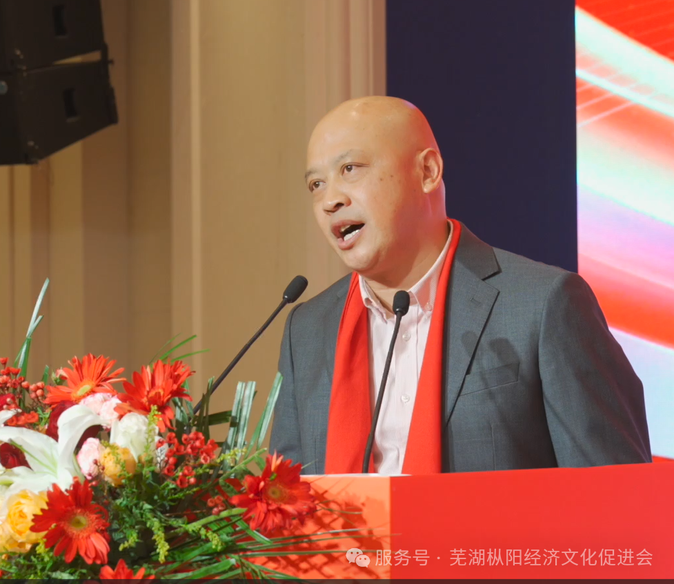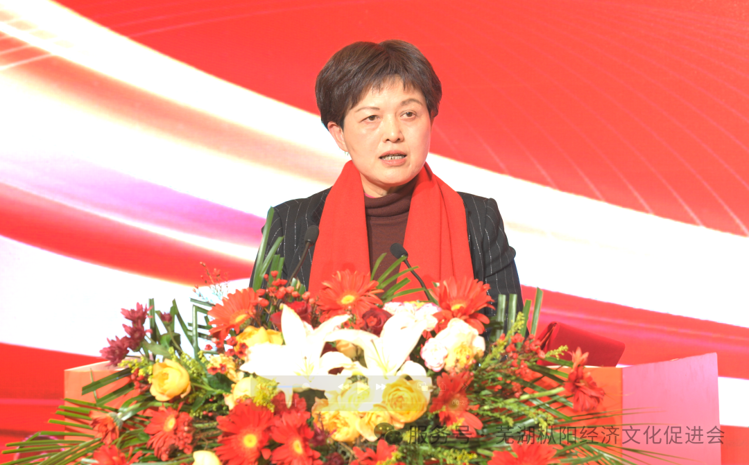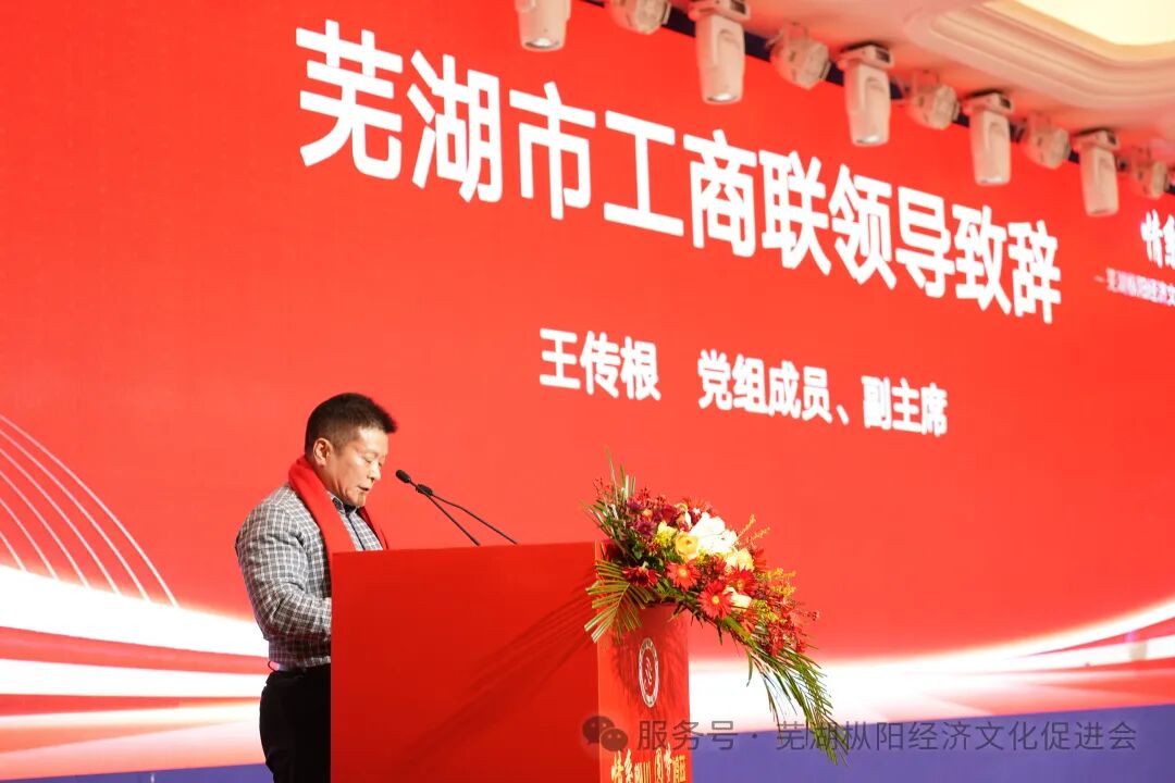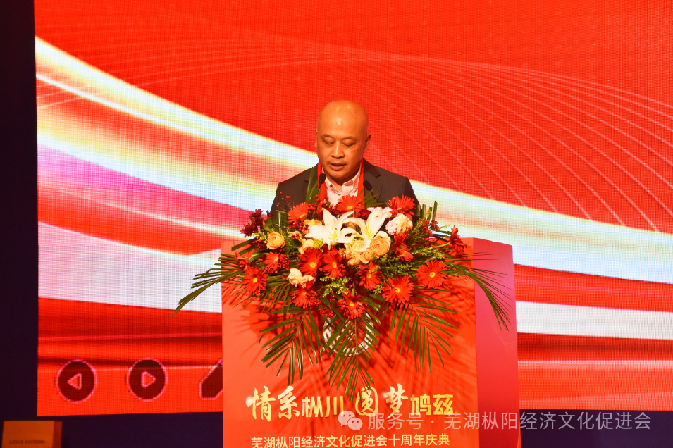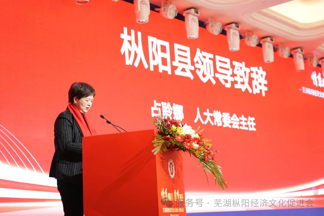 枞阳县人大常委会主任占聆娜、芜湖市工商联党组成员、副主席王传根上台发表致辞,向芜湖枞阳经济文化促进会十周年庆典表示祝贺,期待促进会能够充分发挥自身优势,积极寻求与政府、企业、协会等多方面的合作机会,拓展合作领域,为会员企业创造更多的发展机遇和空间。